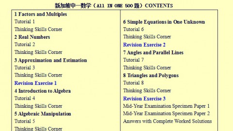 CONTENTS 新加坡中一数学(All IN ONE 500题) 1 Factors and Multiples Tutorial 1 Thinking Skills Corner 2 Real Numbers Tutorial 2 Thinking Skills Corner 3 Approximation and Estimation Tutorial 3 Thinking Skills Corner Revision Exercise 1 4 Introduction to Algebra Tutorial 4 Thinking Skills Corner 5 Algebraic Manipulation Tutorial 5 Thinking Skills Corner 6 Simple Equations in One Unknown Tutorial 6 Thinking Skills Corner Revision Exercise 2 7 Angles and Parallel Lines Tutorial 7 Thinking Skills Corner 8 Triangles and Polygons Tutorial 8 Thinking Skills Corner Revision Exercise 3 Mid-Year Examination Specimen Paper 1 Mid-Year Examination Specimen Paper 2 Answers with Complete Worked Solutions       ····    1 ····    12 ····    27 ····    28 ····    42 ····    59 ····    61 ····    68 ····    78 ····    80 ····    82 ····    88 ····    102 ····    104 ····    115 ····    136 ····    138 ····    150 ····    168 ····    170 ····    173 ····    190 ····    207 ····    208 ····    228 ····    252 ····    254 ····    260 ····    272 ····    285